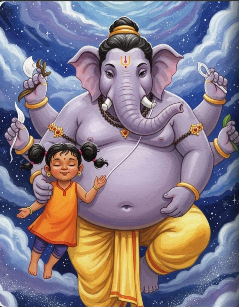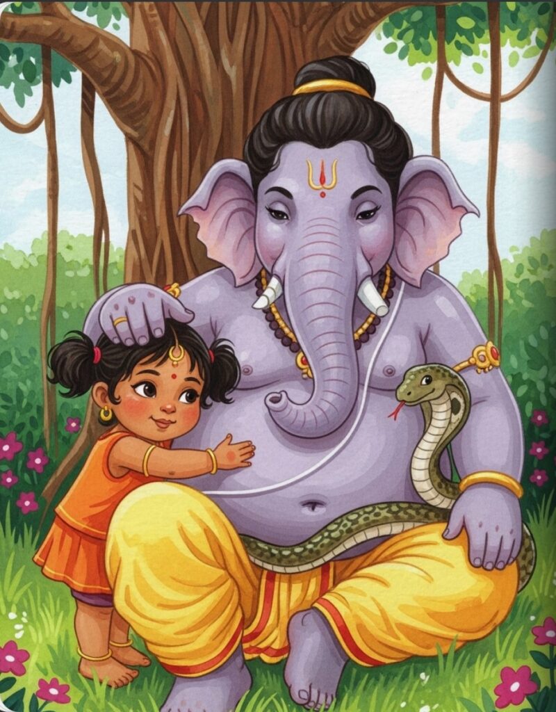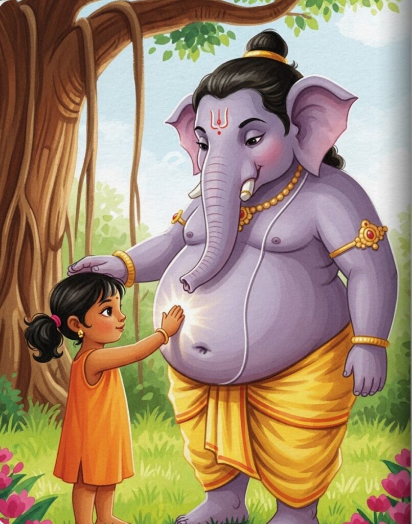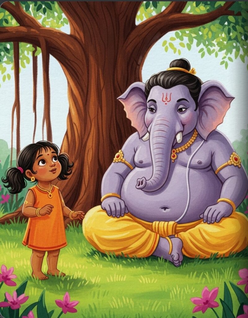 Little Amara lived in a garden full of soft grass and bright flowers. One morning, she saw a very special friend sitting under a big tree. It was Ganesha, with his kind elephant face and his very round belly. He looked as peaceful as a sleeping cloud.