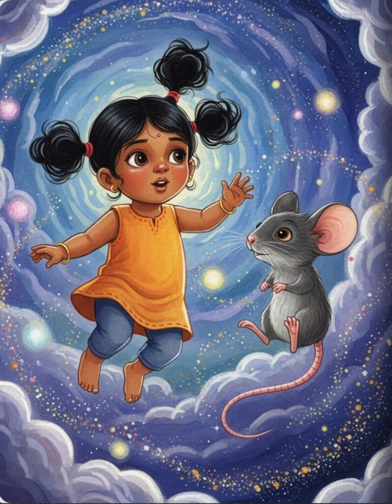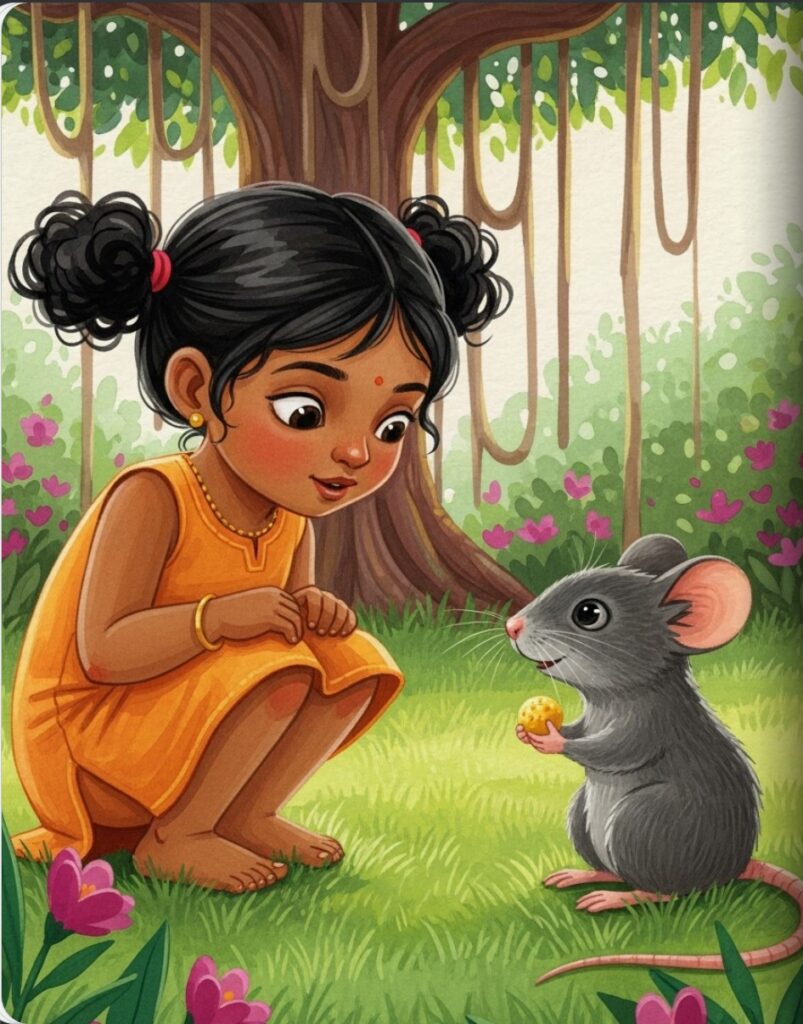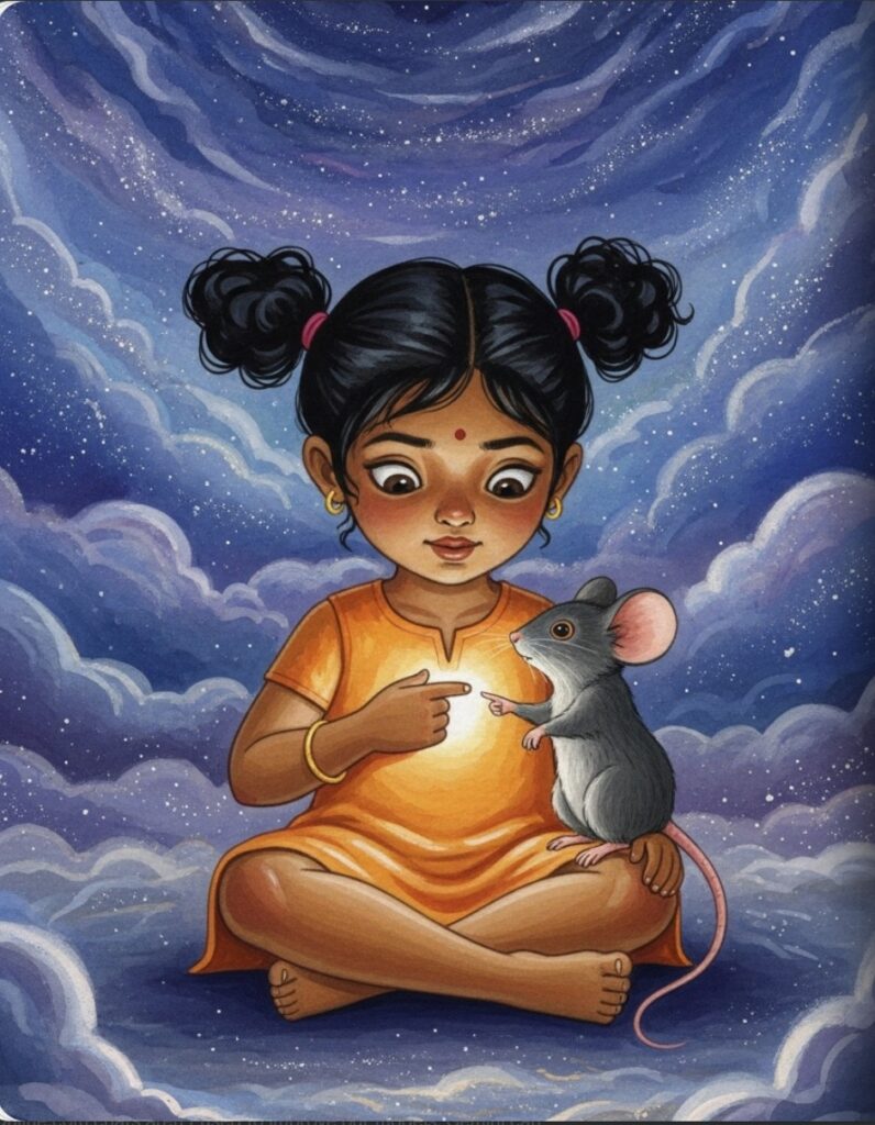 Near Ganesha’s feet, a tiny mouse named Mushika was busy nibbling on a sweet yellow treat. He had big ears and a long, twitching tail. Amara giggled as Mushika looked up and gave a friendly squeak.