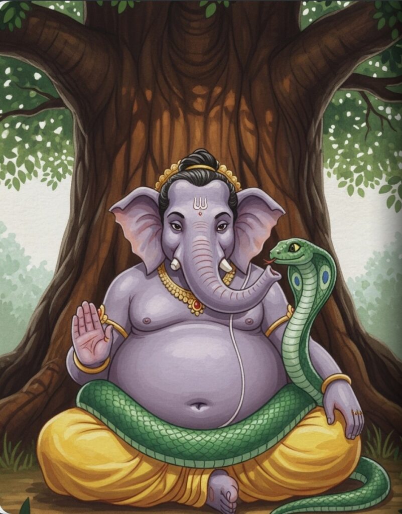 Around Ganesha’s tummy was a shiny, green snake named Vasuki. Vasuki wasn’t scary at all; he sparkled like a necklace made of emeralds. He flicked his tongue and looked at Ganesha with great love.