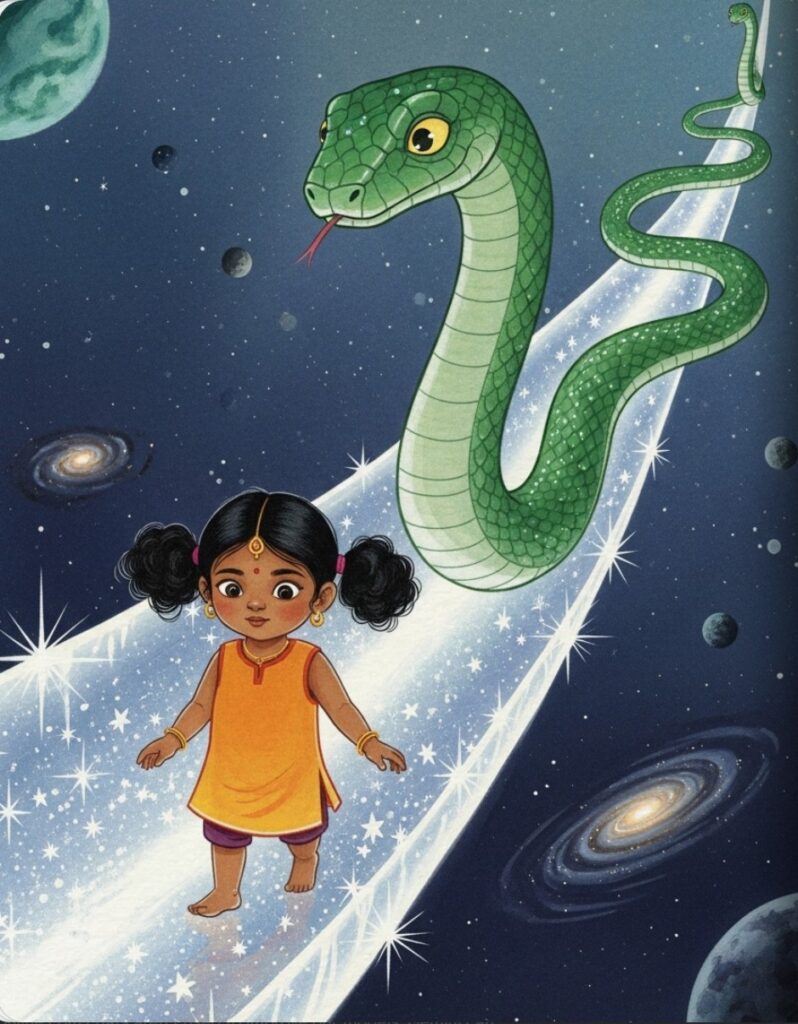 Vasuki stretched out long and thin, turning into a bridge of stars. Amara saw the moon, the sun, and all the planets spinning slowly. “The whole world is in here,” she whispered. Everything was connected, like a giant, beautiful blanket.