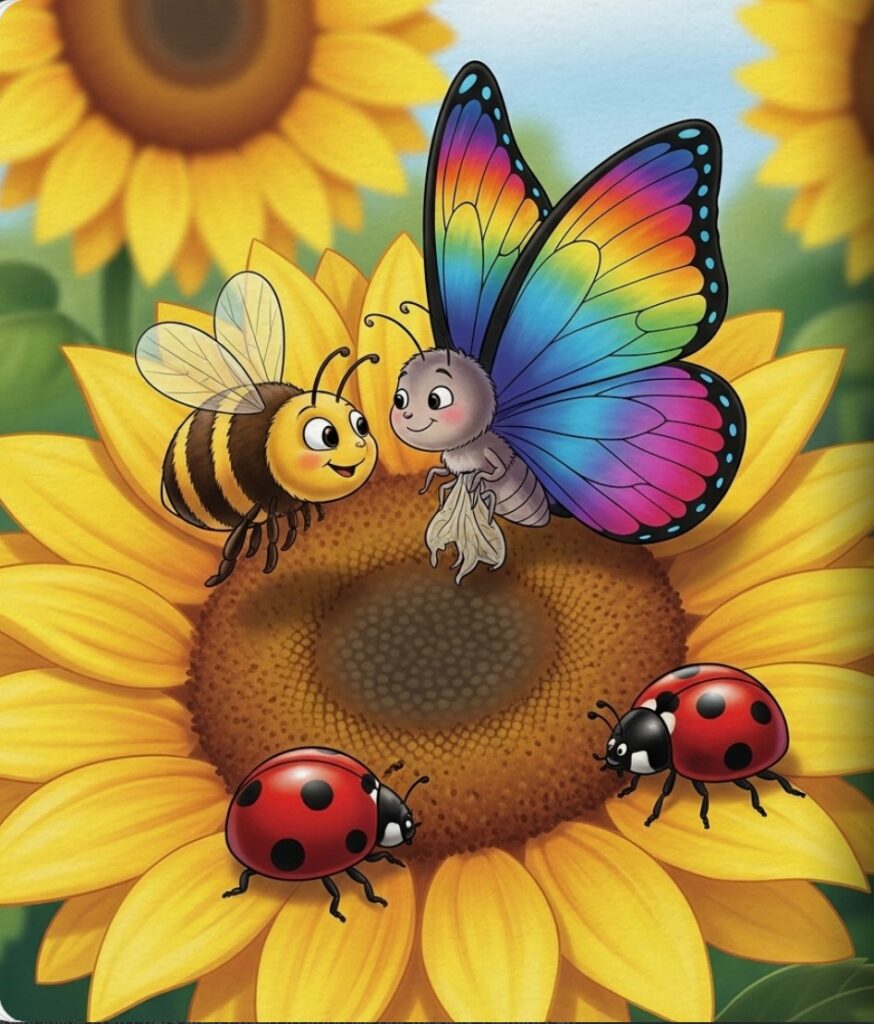 Lolo waved wings at the buzzing bees and smiled at the sleepy ladybugs. Everyone felt happy because Lolo shared gentle, soft love with the world!