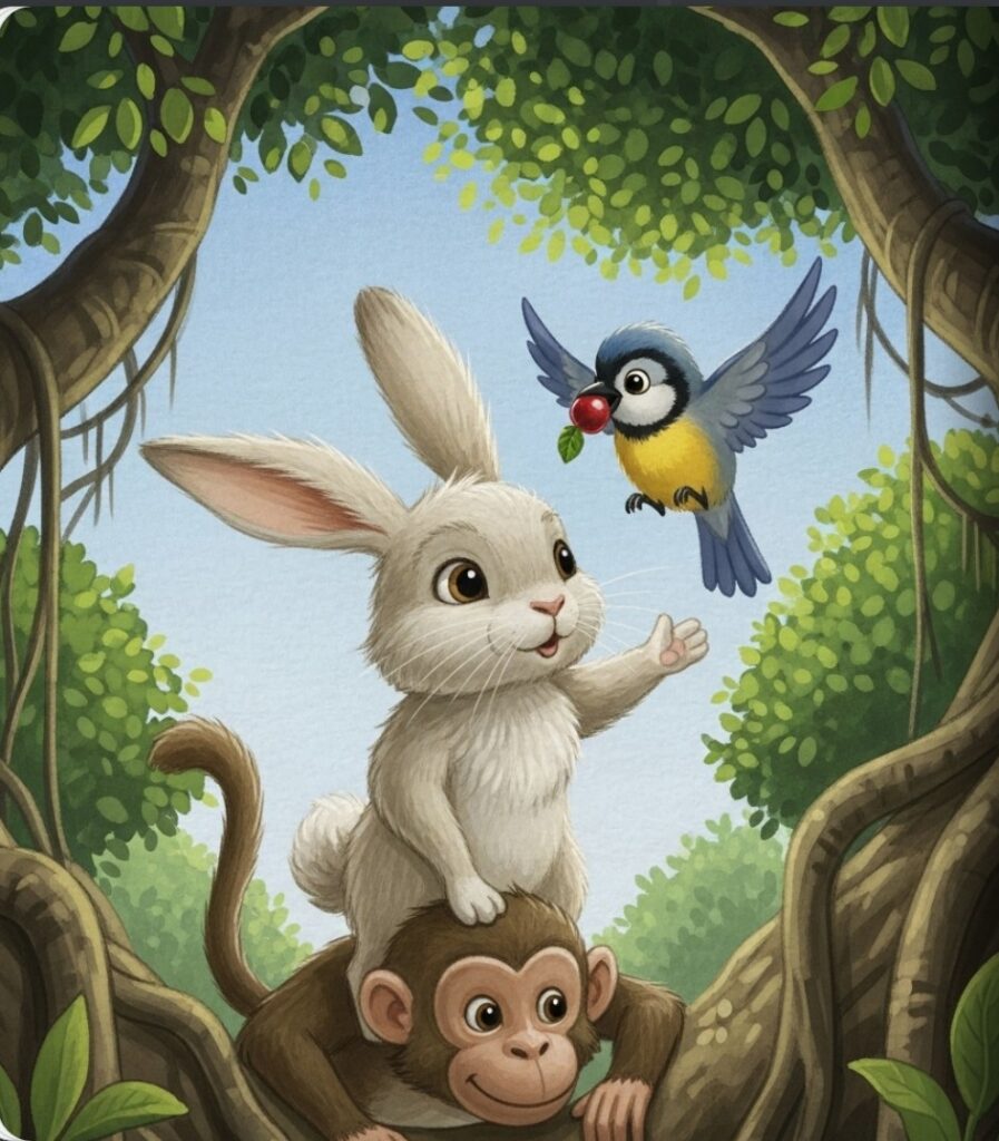 Then, Hopper hopped onto Jojo’s shoulders, and Pip the bird flew to the very top! He picked a yummy fruit and dropped it down for everyone. They all sat together and shared the delicious treat. “Hooray for friends!” They cheered.