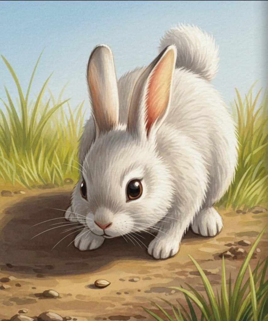 Along came Hopper the rabbit, twitching his long nose. Wiggle, wiggle, sniff! He saw the tiny seed all by itself. “This seed needs a cozy bed!” he said.