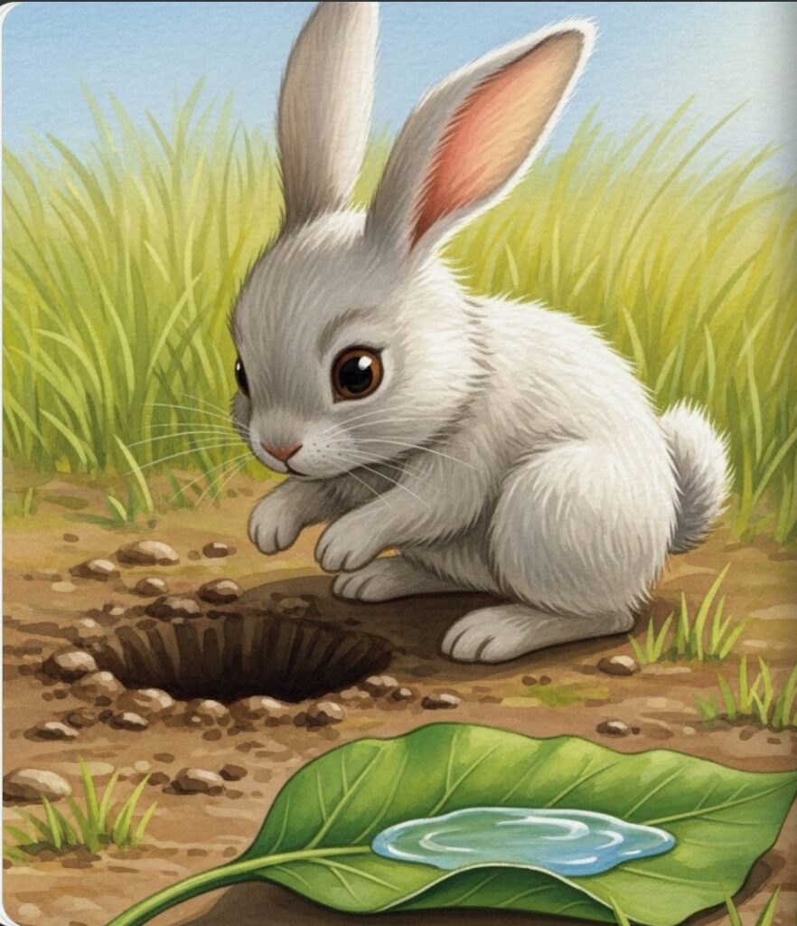 Hopper used his soft paws to dig a little hole. Pat, pat, pat. He tucked the seed inside and gave it a little drink of water from a big leaf. “Sleep tight, little seed,” he whispered.