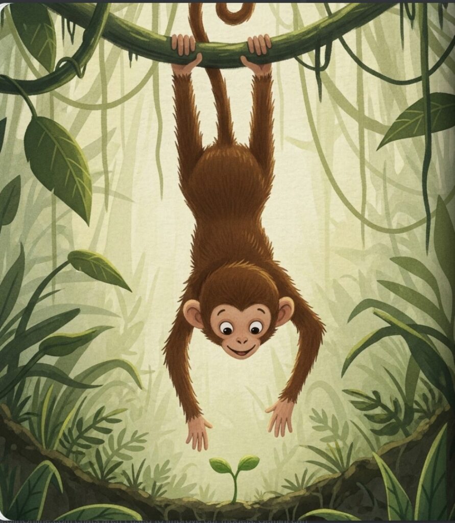 Soon, a little green sprout poked its head out of the ground! Jojo the monkey saw it while swinging from a vine. “Ooh! A new friend!” he chattered happily.