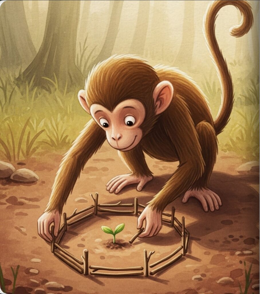 Jojo gathered little twigs and built a tiny fence all around the sprout. “I’ll keep you safe from big clumsy feet,” he said, patting the last twig into place.