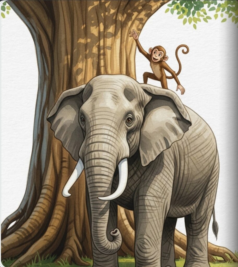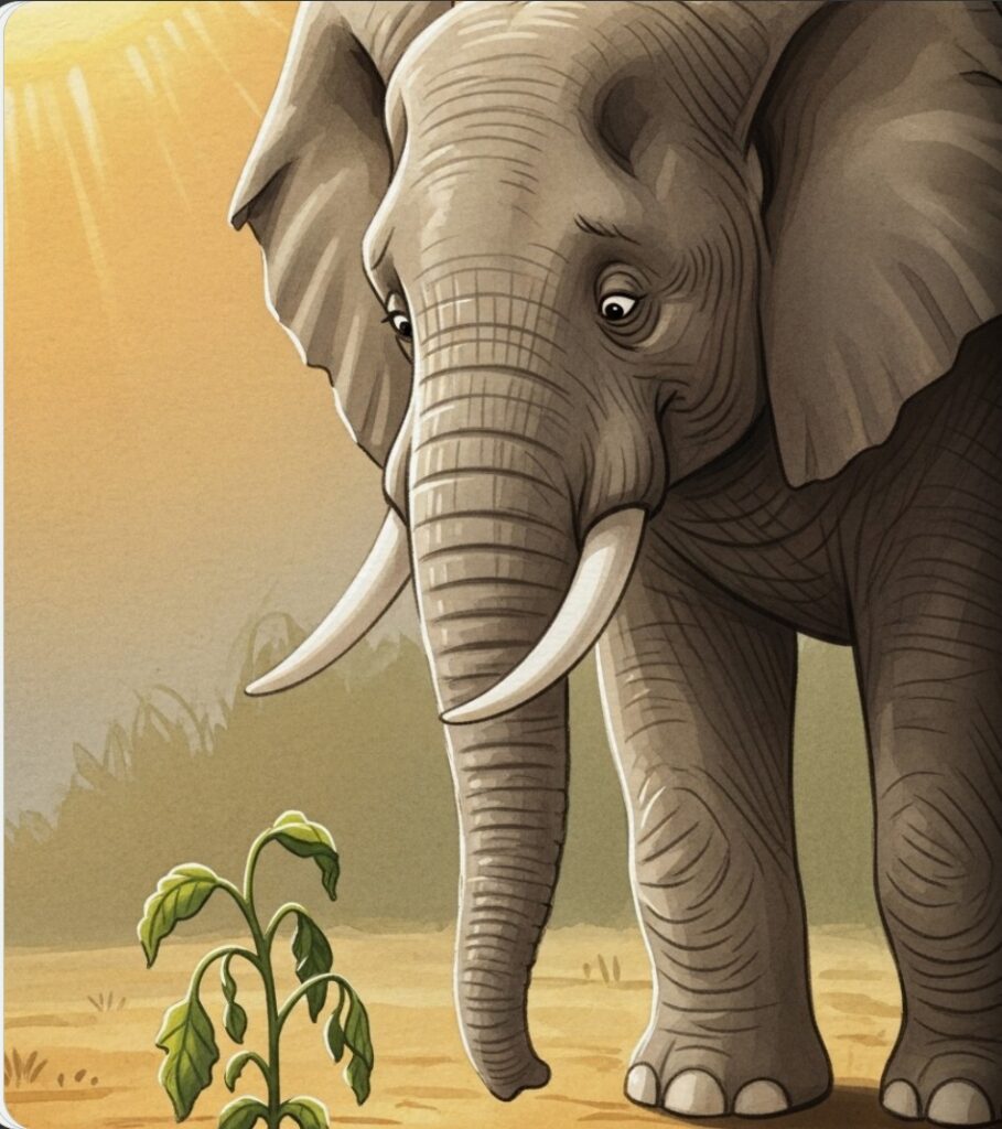 The little plant grew taller, but the sun was very hot, and it was thirsty. Rumble the elephant came by with a slow, heavy tread. Thump, thump, thump. “You look thirsty,” he rumbled in his big, kind voice.