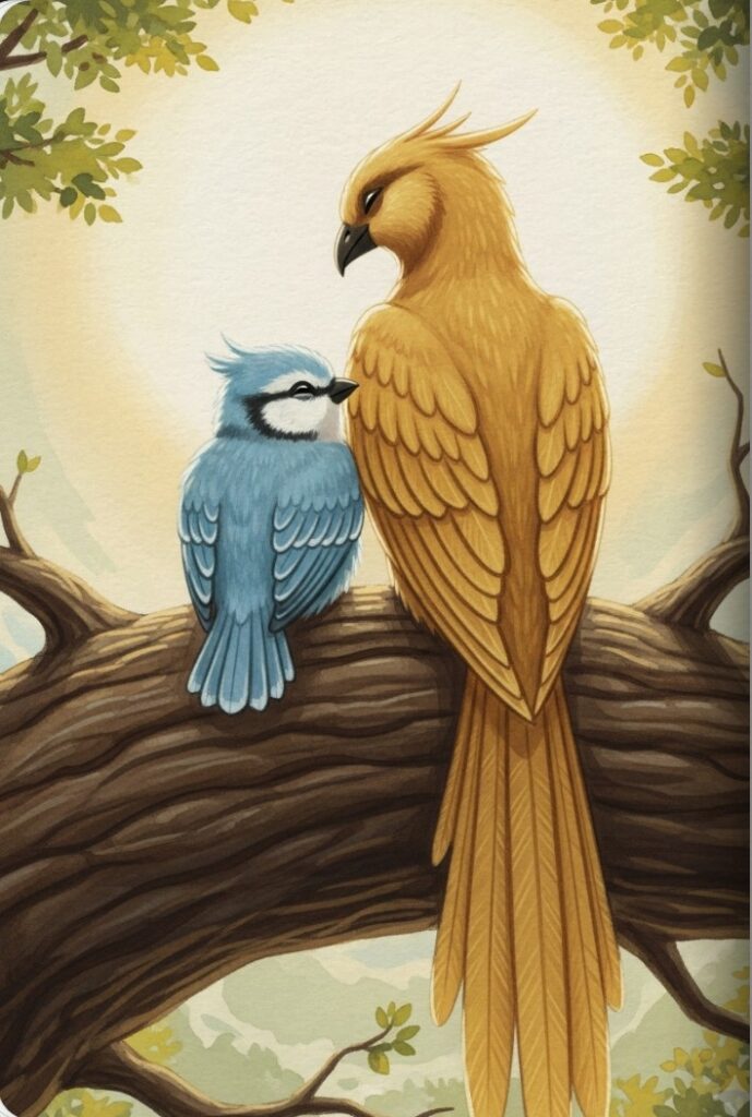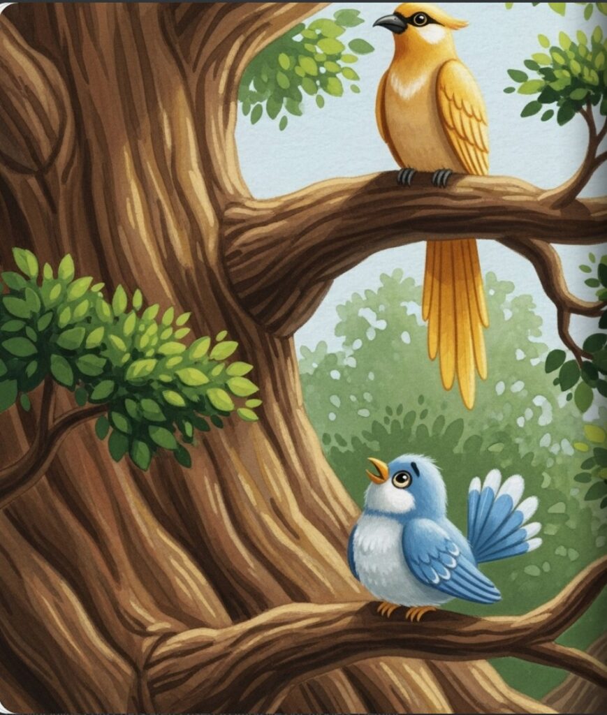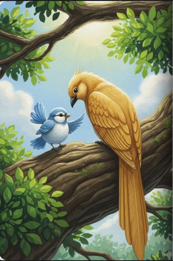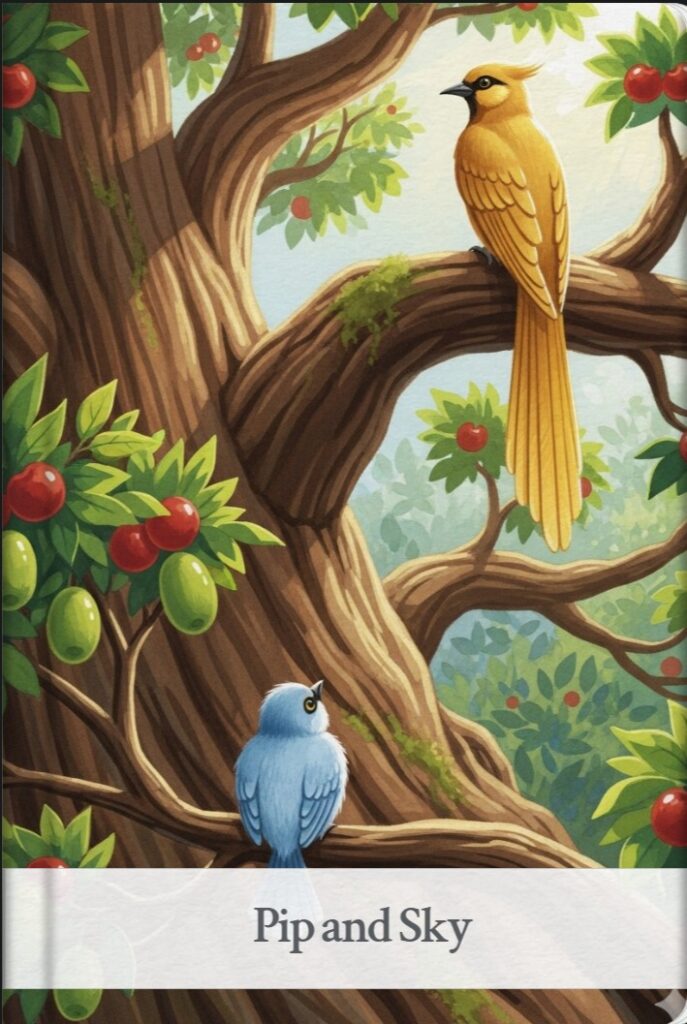 As Pip sniffled, he looked up, up, up to the very top of the tree. There sat another bird. He was big and golden and very quiet. His name was Sky.