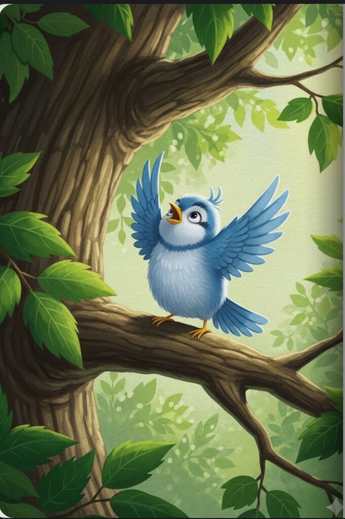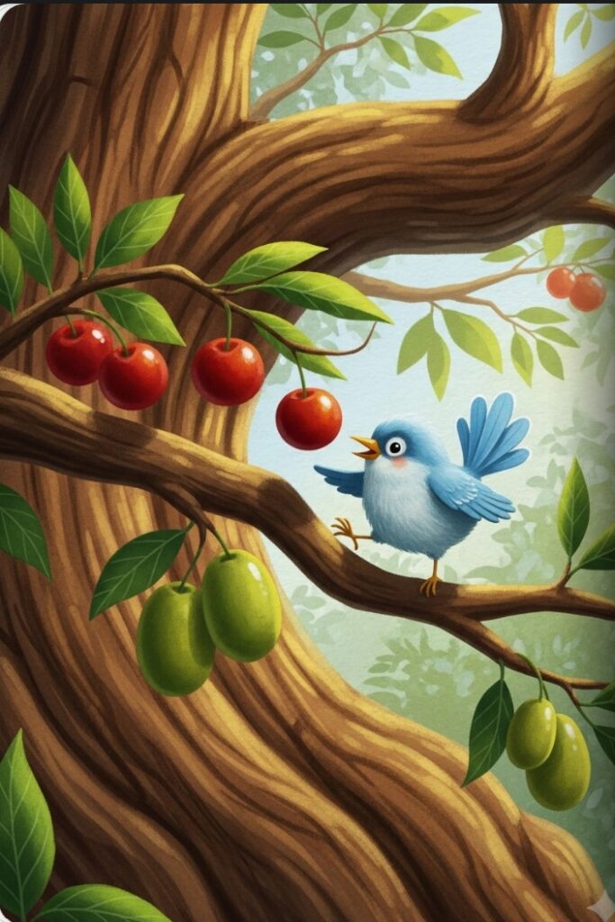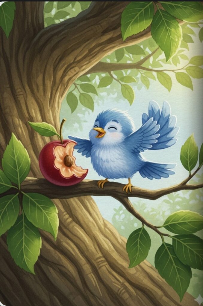 First, Pip ate a sweet red fruit. “Yummy!” he chirped. “This is the best! I feel so happy!” He flapped his little wings and did a happy dance on the branch.