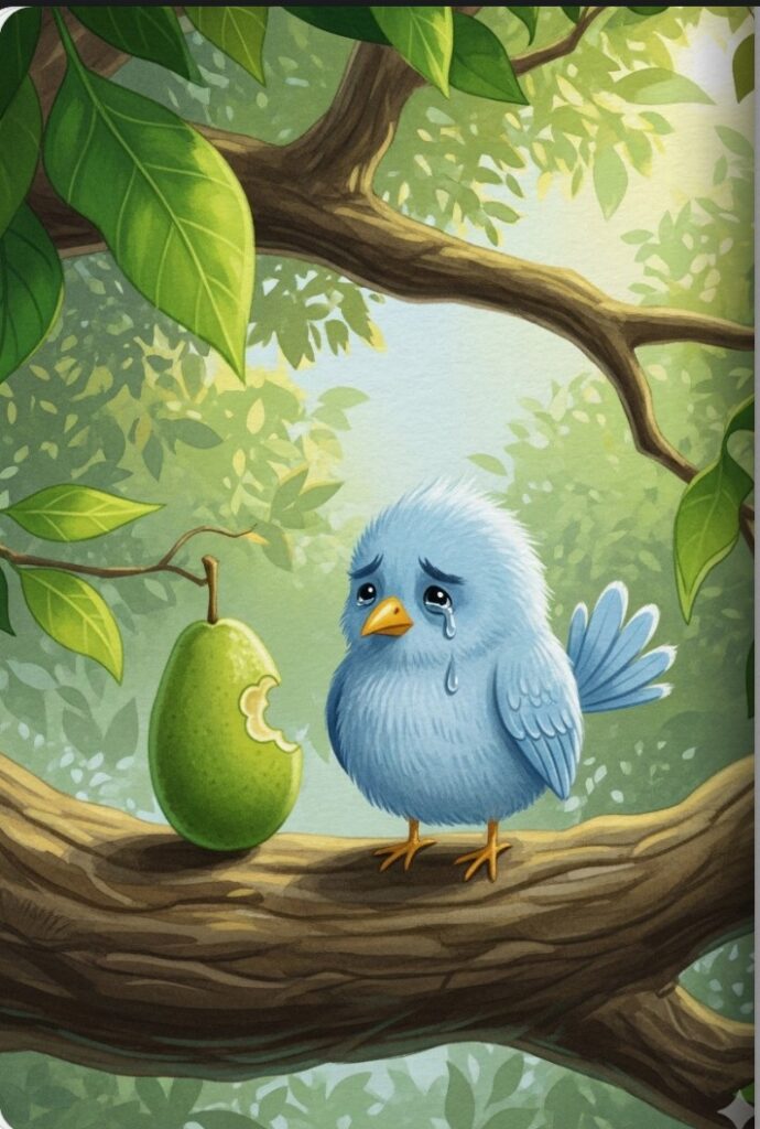 Next, Pip tried a sour green fruit. “Oh, yucky!” he peeped. His beak puckered up, and he felt very, very sad. A little tear rolled down his fluffy cheek.