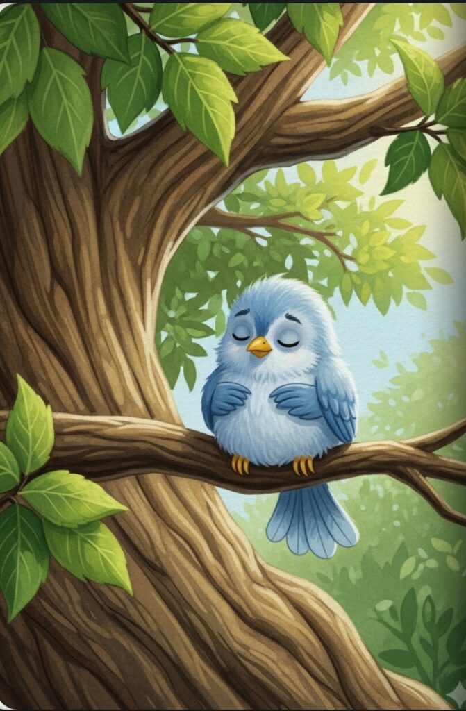 So, Pip tried to be like Sky. He stopped thinking about the fruit. He fluffed his feathers, closed his eyes, and sat very, very still on his branch.