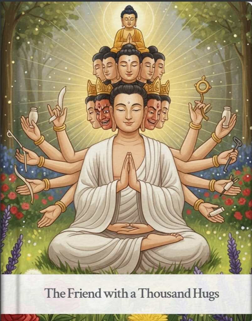 In a sunny, sparkly garden lived the kindest friend you could ever meet. His name was Avalo. He was very special. He had eleven friendly faces to smile with, and a thousand arms to give the best hugs!