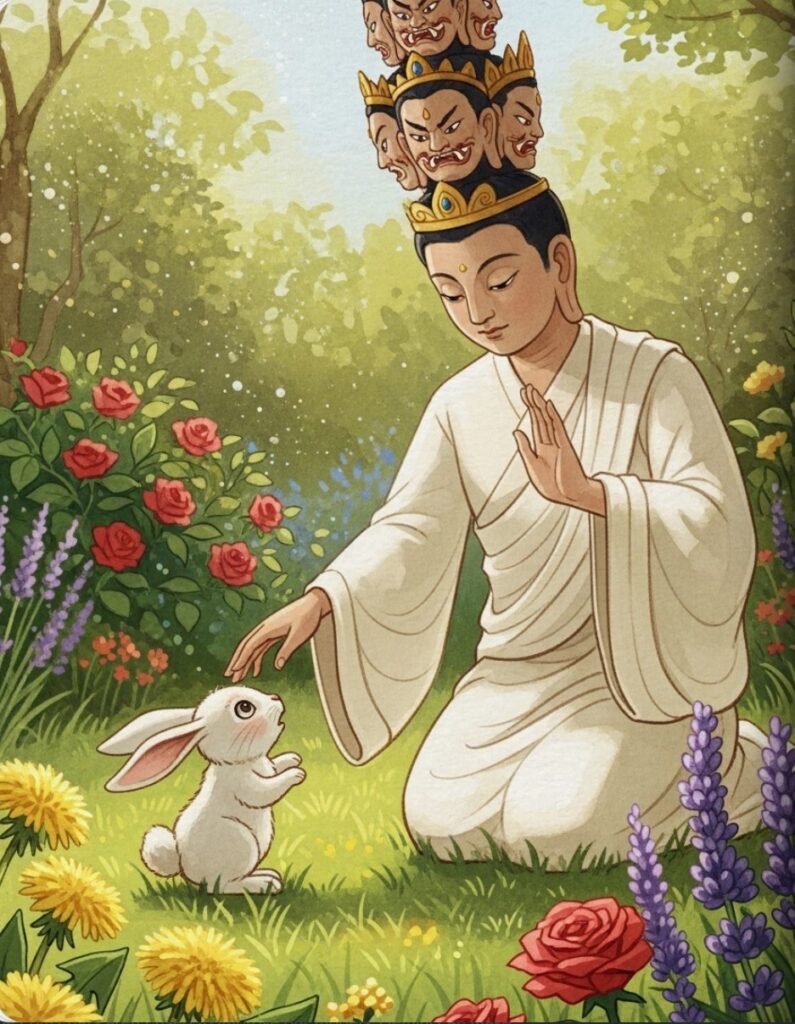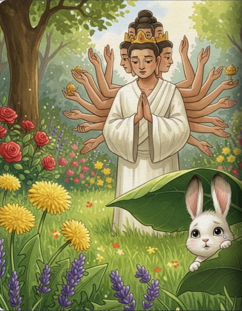 One morning, Avalo saw a little bunny named Asha hiding behind a leaf. Asha was very sad, and a little tear rolled down her fluffy cheek. “Oh dear,” whispered one of Avaloโs faces. “Our friend needs help.”