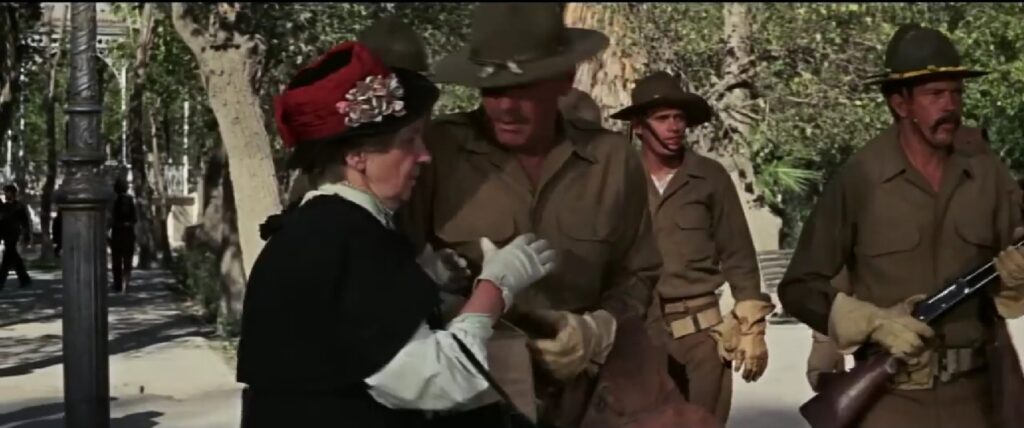 The sequence begins with the titular gang, disguised as U.S. Army soldiers, riding into the dusty, sun-baked Texas border town of Starbuck.