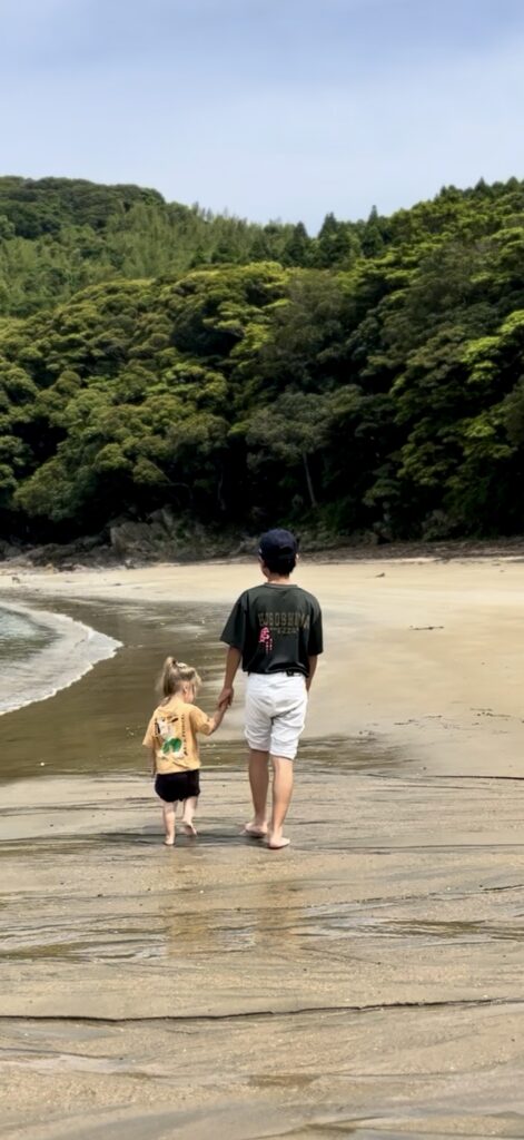 Pure Innocence: Avaleigh (2 years old) and a Japanese boy, hand-in-hand, walked along the beach in Hososhima, Japan on May 15, 2025. Our daughter spontaneously approached the older boy, took his hand, and led the way. His joyful willingness to join her beautifully captured the simple, unconditional love that can blossom between two complete strangers.