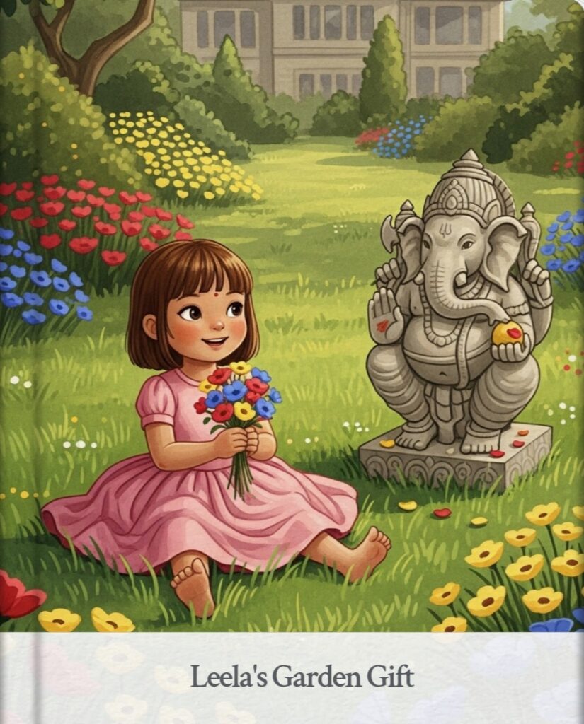 On a bright, sunny morning, Leela’s Garden Gift tells the story of a joyful little girl named Leela, who carefully gathers colorful flowers to create a special present for her beloved elephant statue, Ganesh.