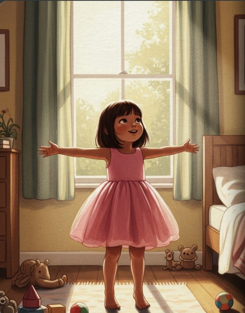 Leela woke up and saw the bright sun. “Good morning!” she chirped. She put on her favorite swirly, twirly pink dress. It was a perfect day to play.