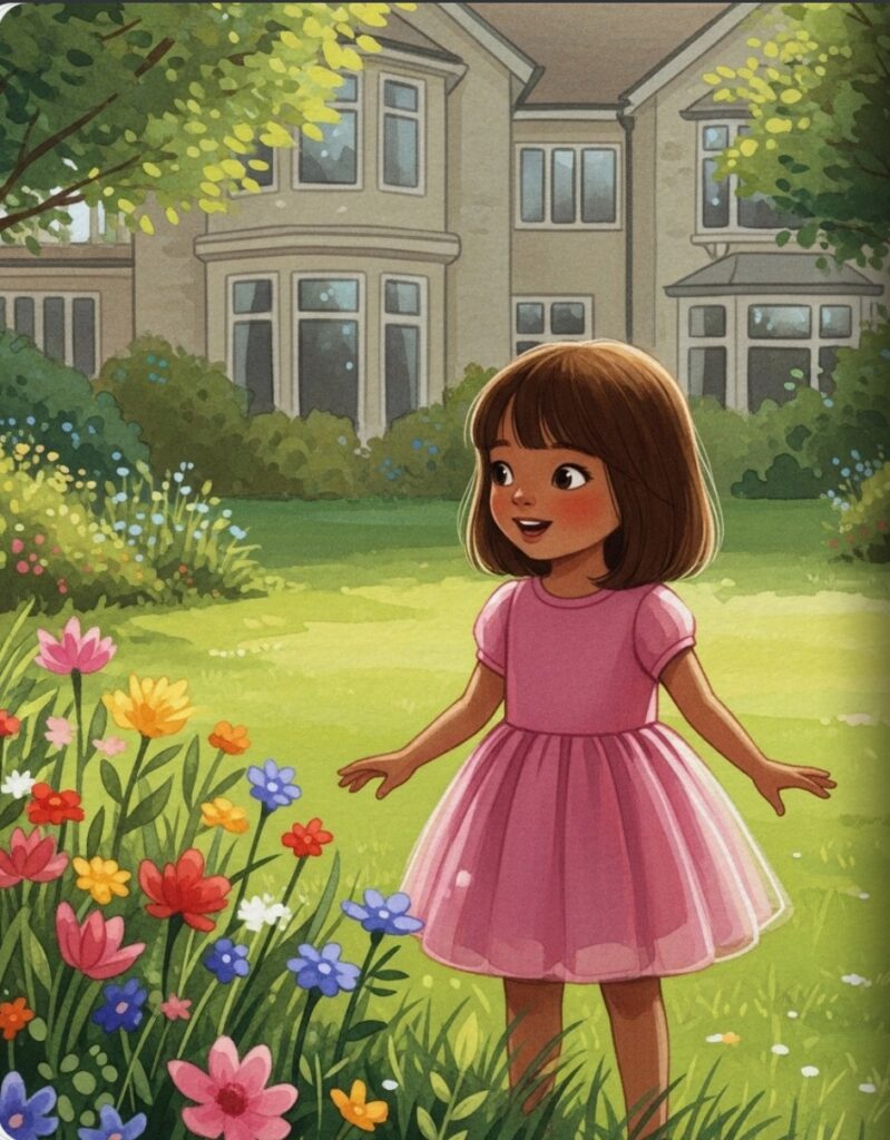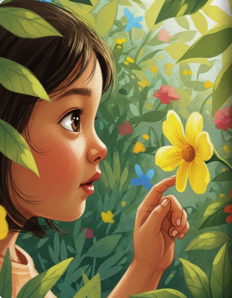 The garden was full of colors. Red flowers, yellow flowers, and blue flowers, too! “Ooooh, so pretty!” whispered Leela, her eyes wide with wonder.