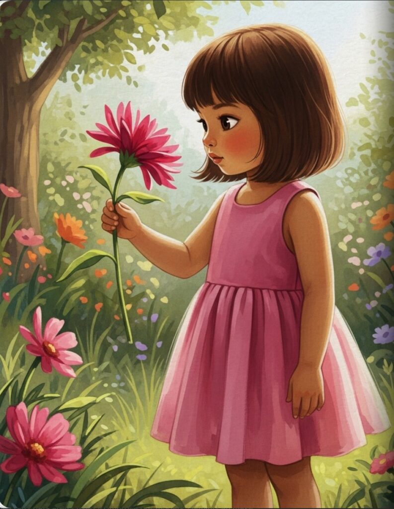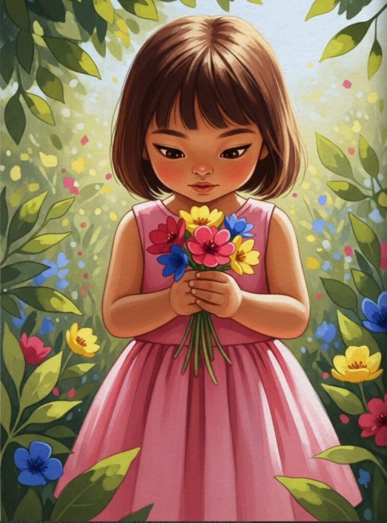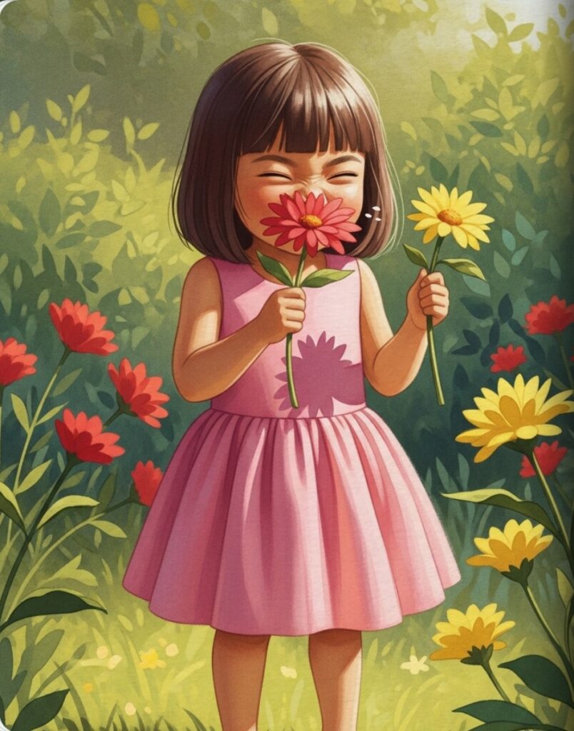 Next, she picked a sunny yellow flower. Pluck! It tickled her nose. “A-a-achoo!” she giggled. Two flowers for her present.