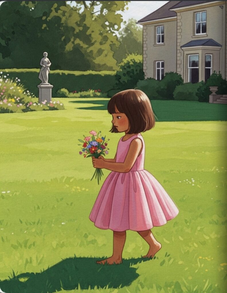 With her beautiful present, Leela walked to the front of the big house. A special friend was waiting for her there.