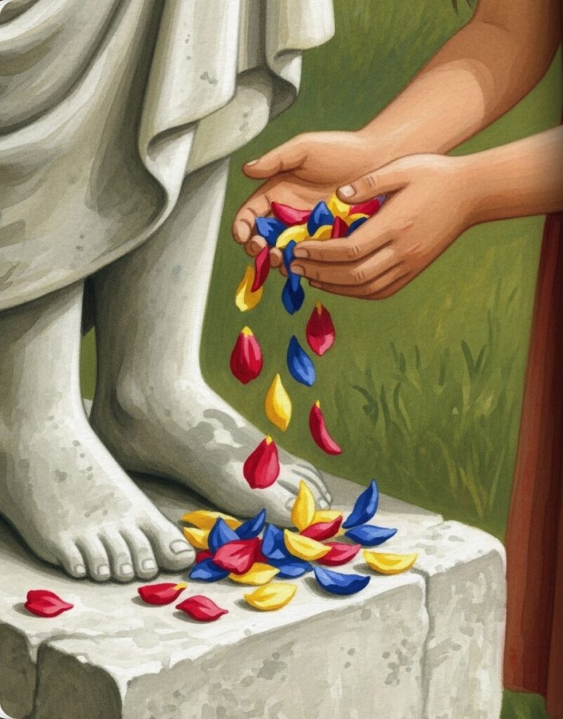 She sprinkled the colorful petals all around. Red petals, yellow petals, and blue petals fell like soft rain.