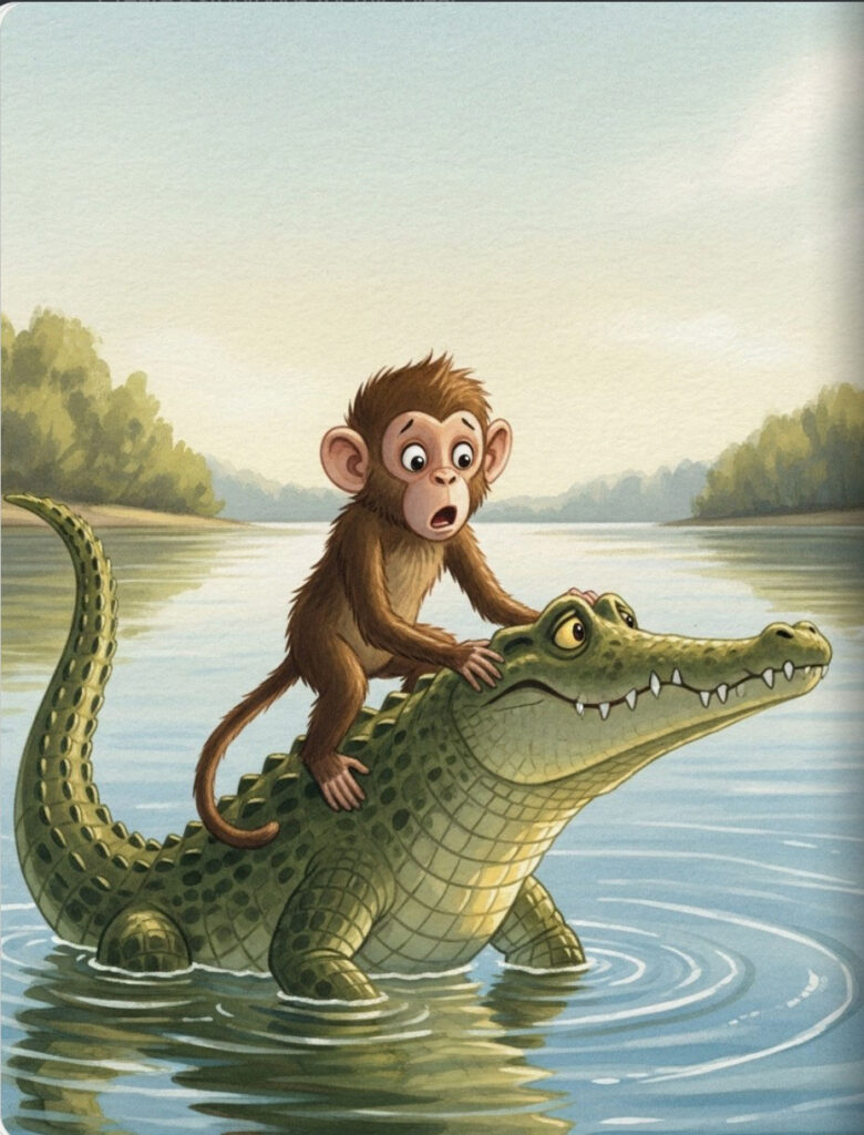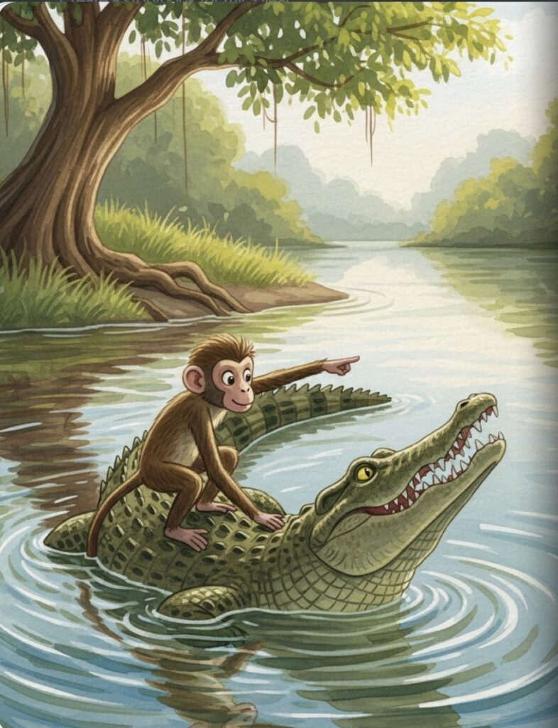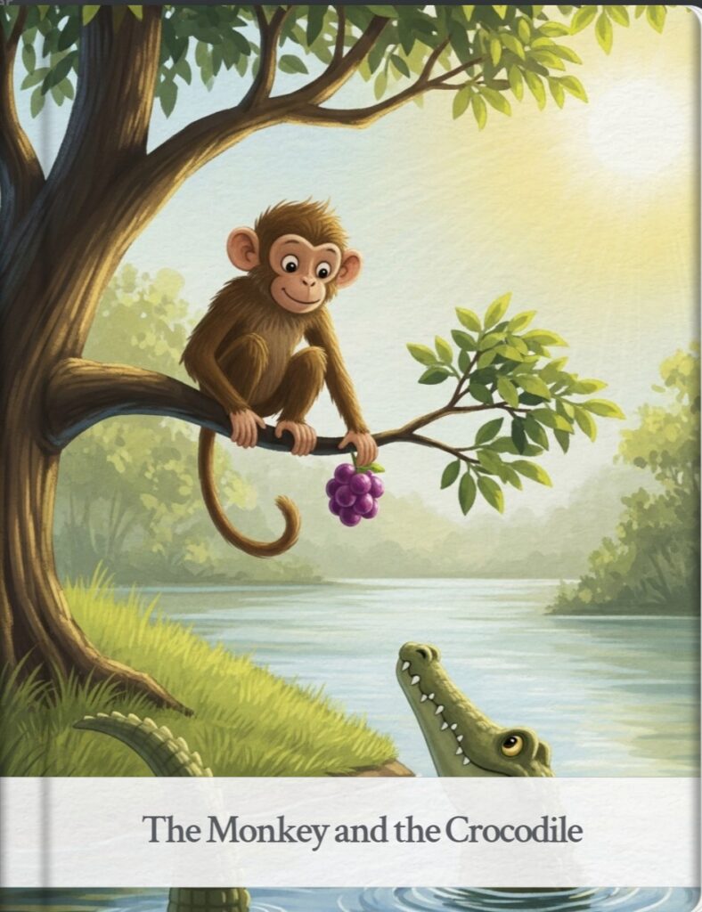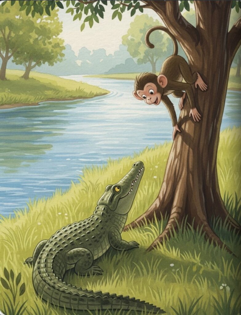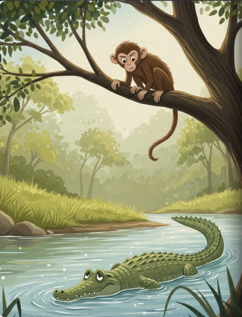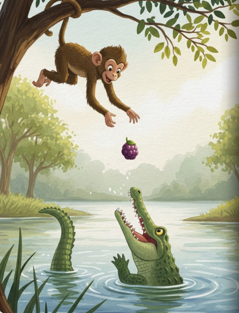 Once upon a time, a kind monkey lived in a tall jambu tree. Below, in the sparkling river, lived a friendly crocodile. They were the best of friends.