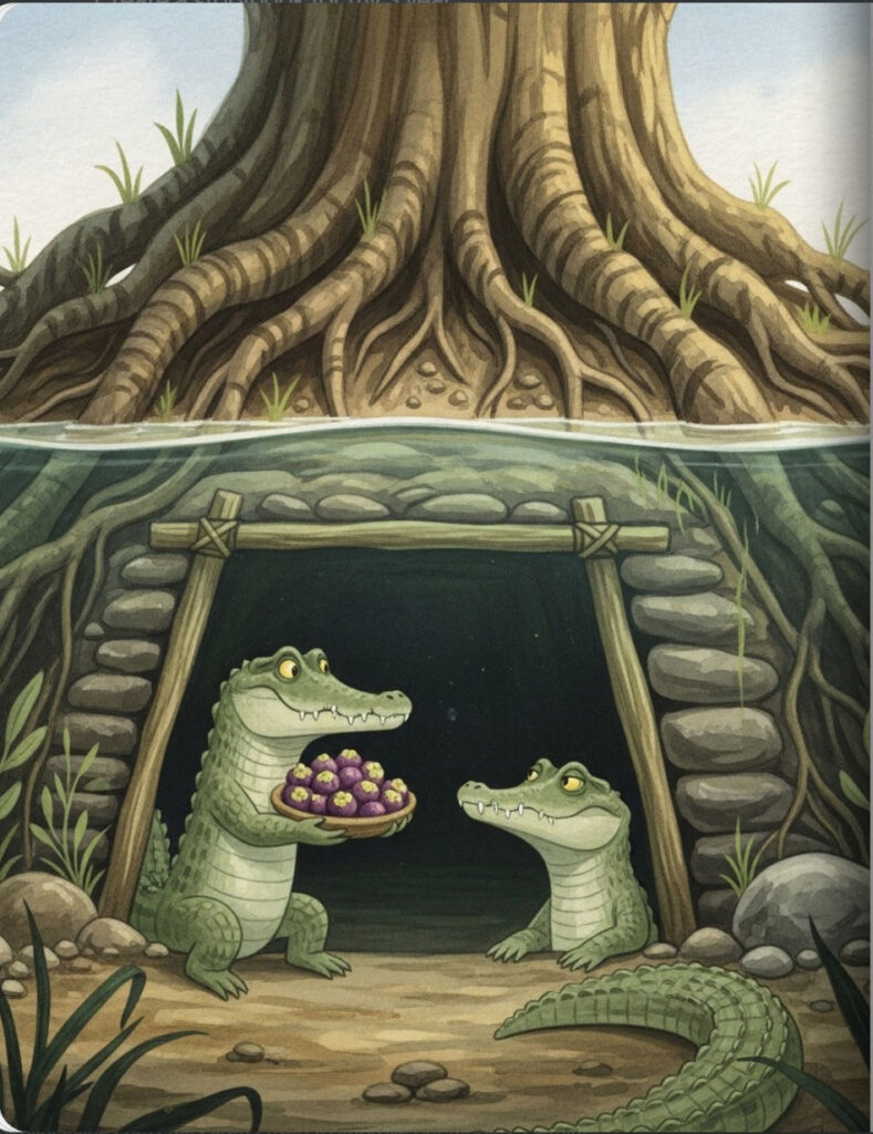 Every day, Kiki the monkey would toss sweet, juicy jambu fruits down to Crocky the crocodile. “For you, my friend!” he would chatter happily.