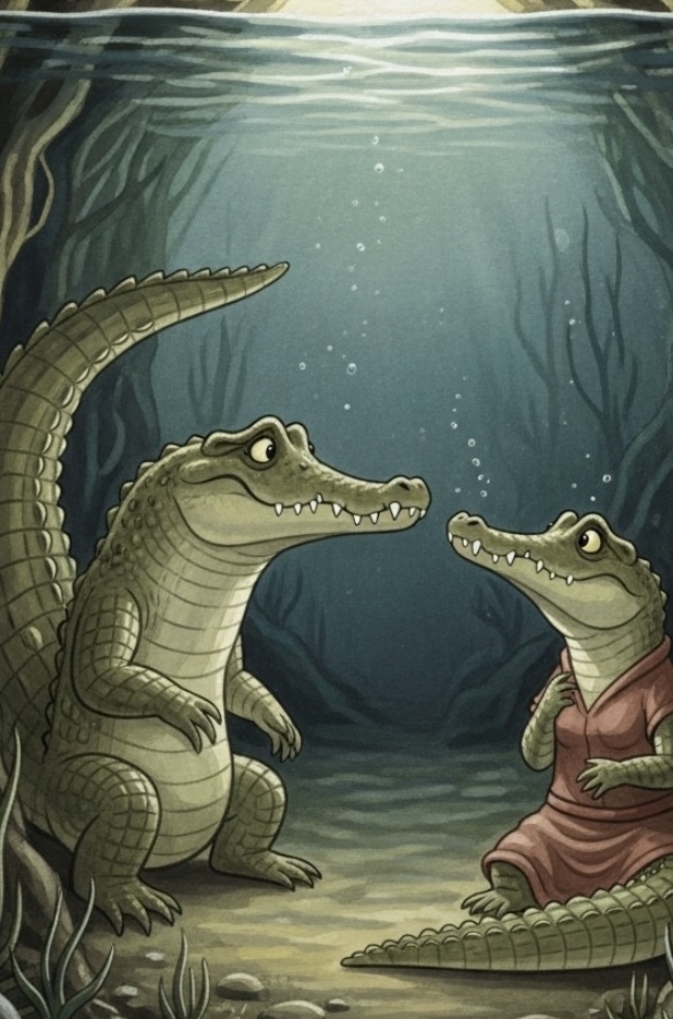 So, Crocky went to Kiki. “My wife wants to meet you!” he said. “Hop on my back, and I’ll take you across the river to our home.”