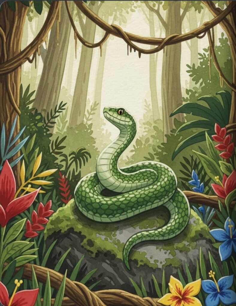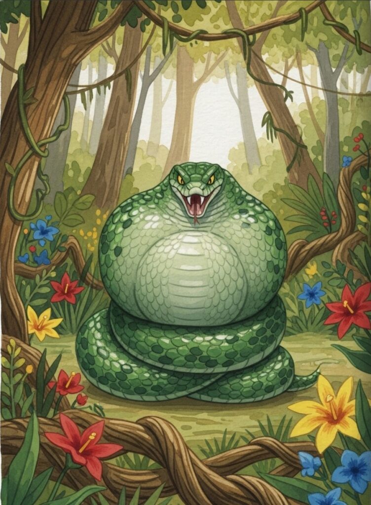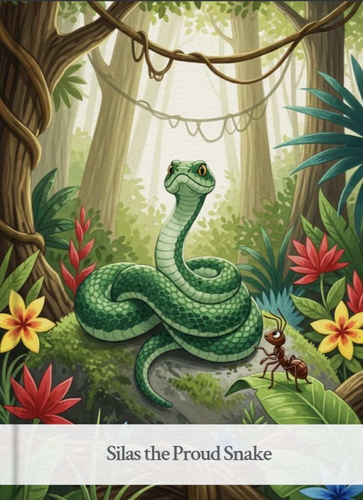 In the big, green jungle, lived a very big snake named Silas. “I am the biggest and the best!” he would hiss. “S-s-so s-s-strong!”