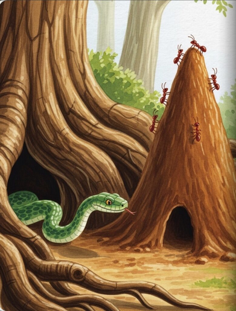Silas did not like his new neighbors. He slithered to the anthill and hissed, “Go away, little ants! This is my home now. I don’t want you here!”