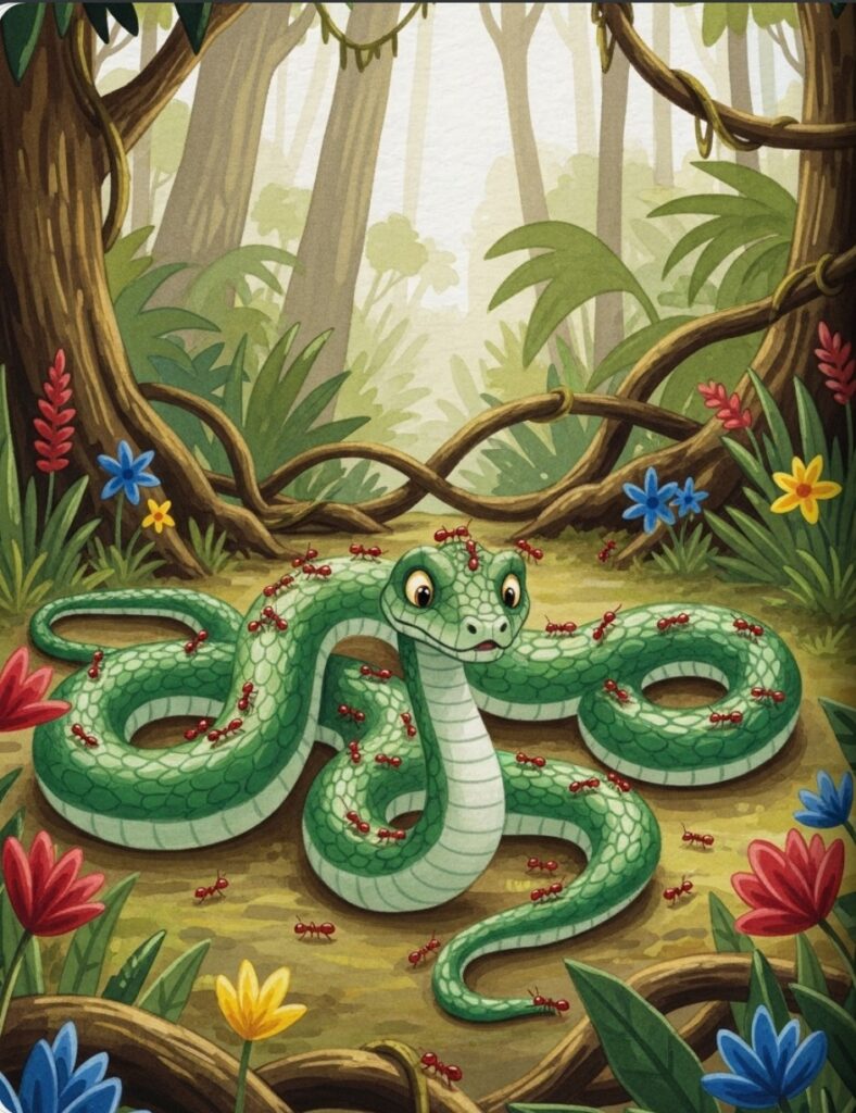 The tiny ants crawled all over the big snake. Ouch! Ouch! Ouch! They gave him tiny little bites. “Ouchy!” cried Silas. “S-s-stop, please!”
