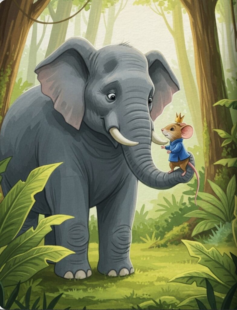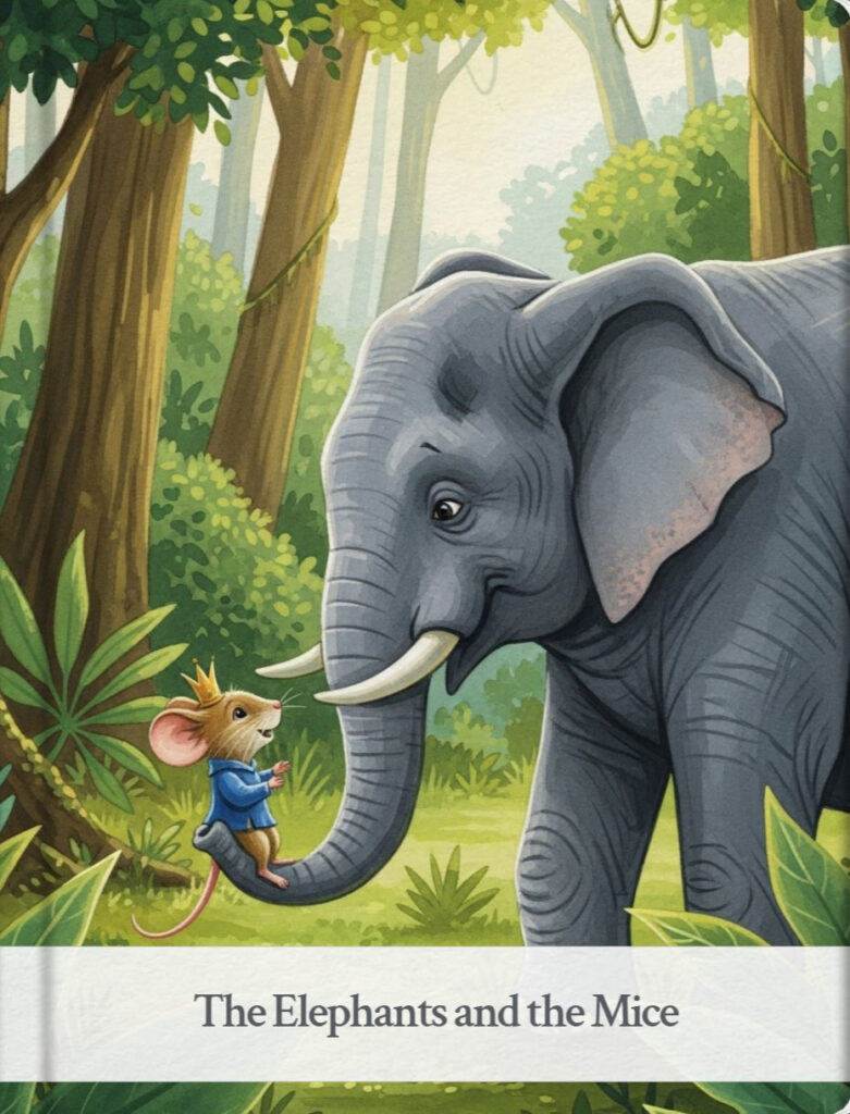 “We are free!” trumpeted King Raja. He gently lifted the little mouse king with his trunk. “Thank you, my little friend. You saved us! A friend in need is a friend indeed.” And from that day on, the elephants and the mice were the best of friends.