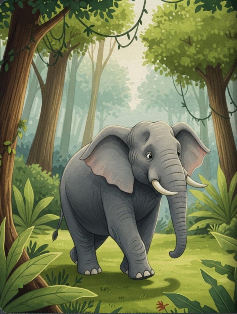 Deep in the jungle, a big, happy family of elephants lived. Their leader was a kind king named Raja. Every morning, they walked to the lake for a big drink of water. THUMP, THUMP, THUMP went their big feet.